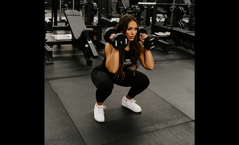 Your feet should be wider than shoulder width and your toes should be pointed out. While holding the dumbbell underneath you, get down low and then push up through your heels. Think about pushing your feet into the ground and not pulling the weight up.